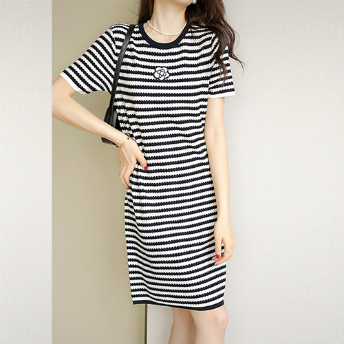- 다이뻐 빅사이즈 부드러운 신축성좋은 장미패치 루즈핏 스트라이프 반팔 니트원피스