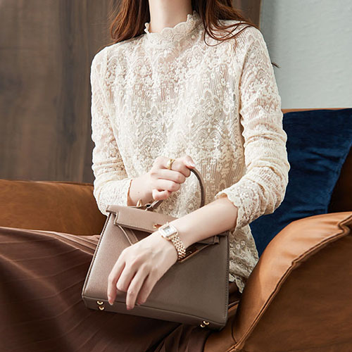 - 다이뻐 사계절 부드럽고 신축성좋은 고급 레이스 시스루 플라워 자수 이너 레이어드 시스루 블라우스