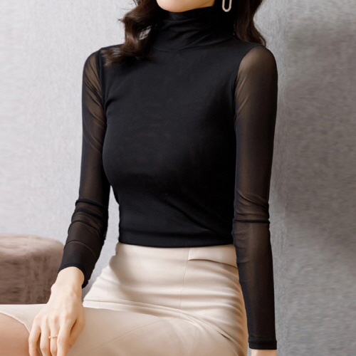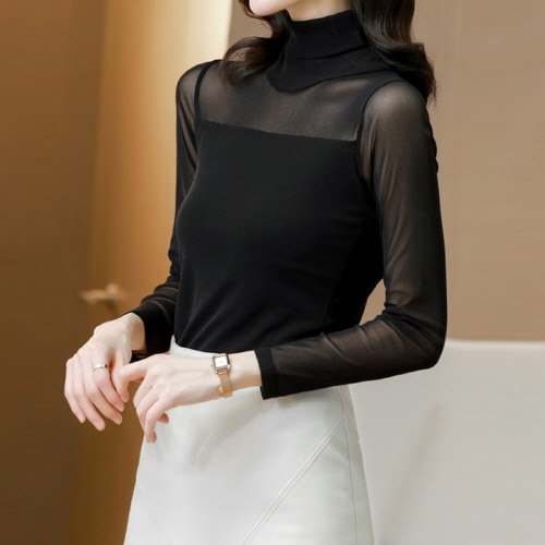 - 다이뻐 44~88 빅사이즈 블랙 하객패션 출근룩 이너 레이어드 시스루 레이스 목폴라 블라우스