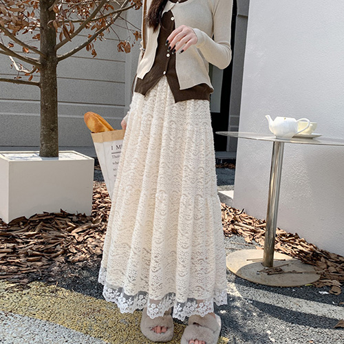 - 다이뻐 봄가을 겨울 기모 3단 셔링 프릴 웨이브 플레어 플라워 레이스 롱스커트
