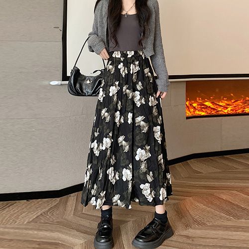 - 다이뻐 가을겨울 플라워 꽃 기모 안감 링클 롱스커트