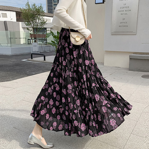 - 다이뻐 봄가을 고급스러운 결혼식하객패션 링클 그린 핑크 꽃플라워 주름 플리츠 롱스커트
