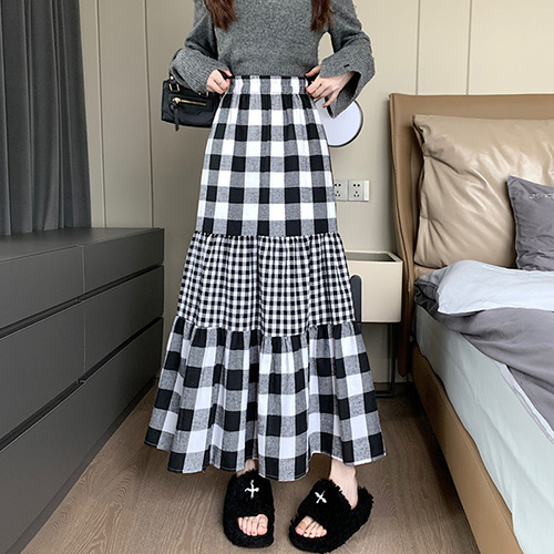 - 다이뻐 봄가을 밴딩 풍성한 3단 셔링 캉캉 체크 롱스커트
