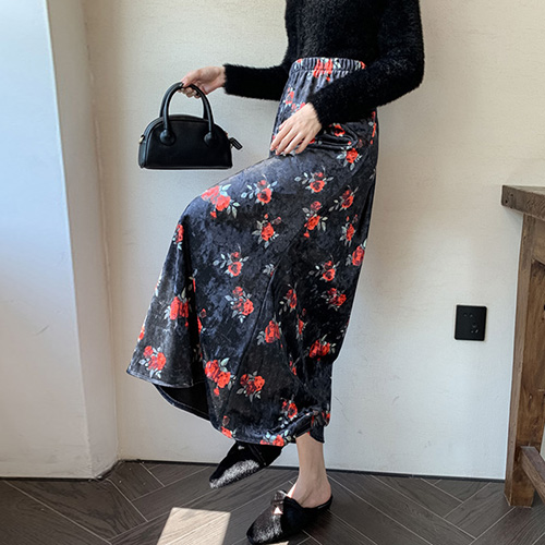 - 다이뻐 가을겨울 부드러운촉감 플라워 꽃 벨벳 인어스타일 머메이드 롱스커트
